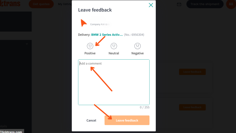 Clicktrans Help CenterHow can I provide feedback? The feedback process involves leaving a short comment about the performance of the transport provider: 1) Log in 2) Go to Feedback > Leave feedback and click on Leave feedback on the transaction you wish to rate. If this tab is empty, it means that you have no transactions to rate. 3) Select one of three available feedback ratings – positive, neutral or negative – and write your comment. Comments can only be posted to finalised transactions.