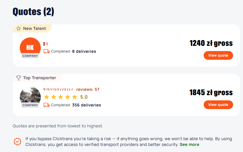 You can check the quotes from transport providers on your listing page.