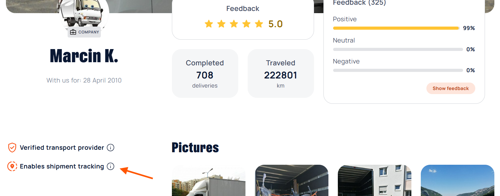 Couriers who have enabled shipment tracking for 8 out their 10 most recent transport jobs receive the shipment tracking badge. This will be visible to the customer next to each of your quotes, which increases your chance of being chosen for the job.