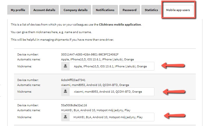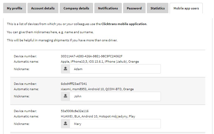 Naming the devices that are co-using the “Clicktrans – for couriers” app