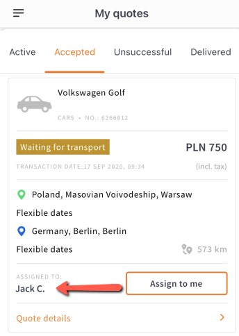 - While browsing through accepted quotes on the app, you will be able to see who is assigned to a specific delivery: