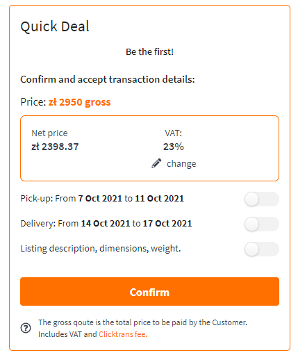Transport Providers that meet certain criteria get access to Quick Deals. These are listings where the client determines the budget and the Transport Provider can accept the listing - fast and easy. The customer doesn't have to confirm anything. Accepting the job by Transport Provider equals the conclusion of the transaction.