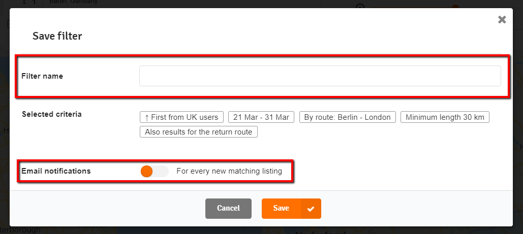 A window will appear, which will allow you to name your set of filters and choose if you wish to receive e-mail notifications whenever a new listing appears that matches the criteria you’ve chosen: