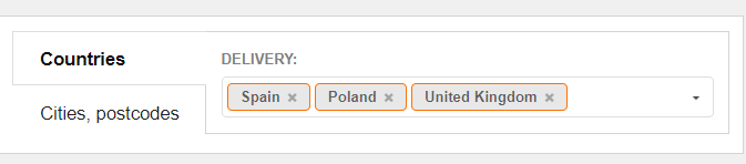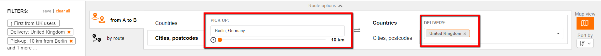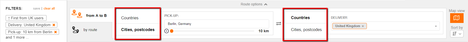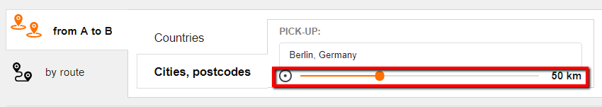 Please note that both fields (for pick-up point and unloading point) have two tabs: “Countries” and “Cities, postcodes”.